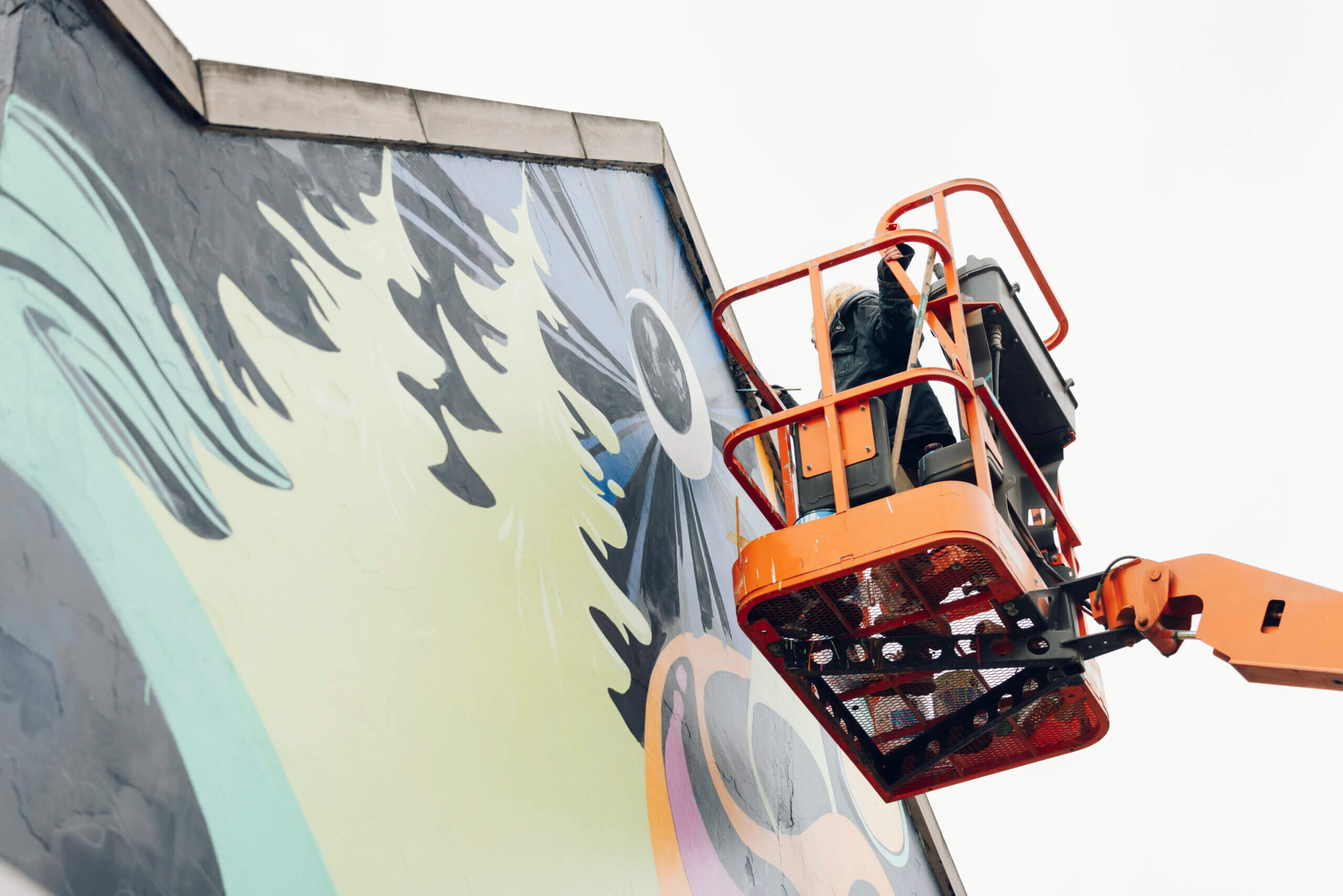 An action shot: Artist Son Visual creating their mural masterpiece which now graces the north side of Vivant Brewery and Spirits. Find it at tour stop #18.
